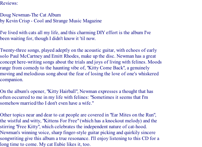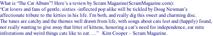 Kitty with Mic - Doug Newman The Cat Album, Cat Songs The Cat Album     by Doug Newman song clips: Doug Newman Music - page two Doug Newman Albums Doug Newman Song Lyrics Doug Newman : Calendar Doug Newman : Contact Doug Newman photos Doug Newman : Press, Reviews Doug Newman: News Guestbook Doug Newman Music - page three Doug Newman Links nice Seattle Weekly mention Kitty with Her Mouse - Doug Newman The Cat Album, Cat Songs Kitty with her mouse Kitty with mic Pokie and Rusty more photos Google Play Press: amazon Doug Newman Music - page one (the original ‘01 album) The Cat Album ‘14 (The Cat Album ‘14  (director’s cut) song list) © Doug Newman The Cat Album ‘14 (director’s cut) CD at CreateSpace CD at CreateSpace $14.99 CD at CreateSpace Kitty Philosophical Cat Waltz (new “The Cat Album ‘14” song) My Kitty Likes to Eat Green Peas  (original ‘01 album clip) me 2000 in the midst of kitten and cat mayhem me 2000 me ‘10 approx. me ‘09 The Fab Four - Rusty, Dusty, Clemintine and Pokie - Doug Newman The Cat Album, Cat Songs, Kitten Songs The Fab Four -            Rusty, Dusty, Clementine and Pokie